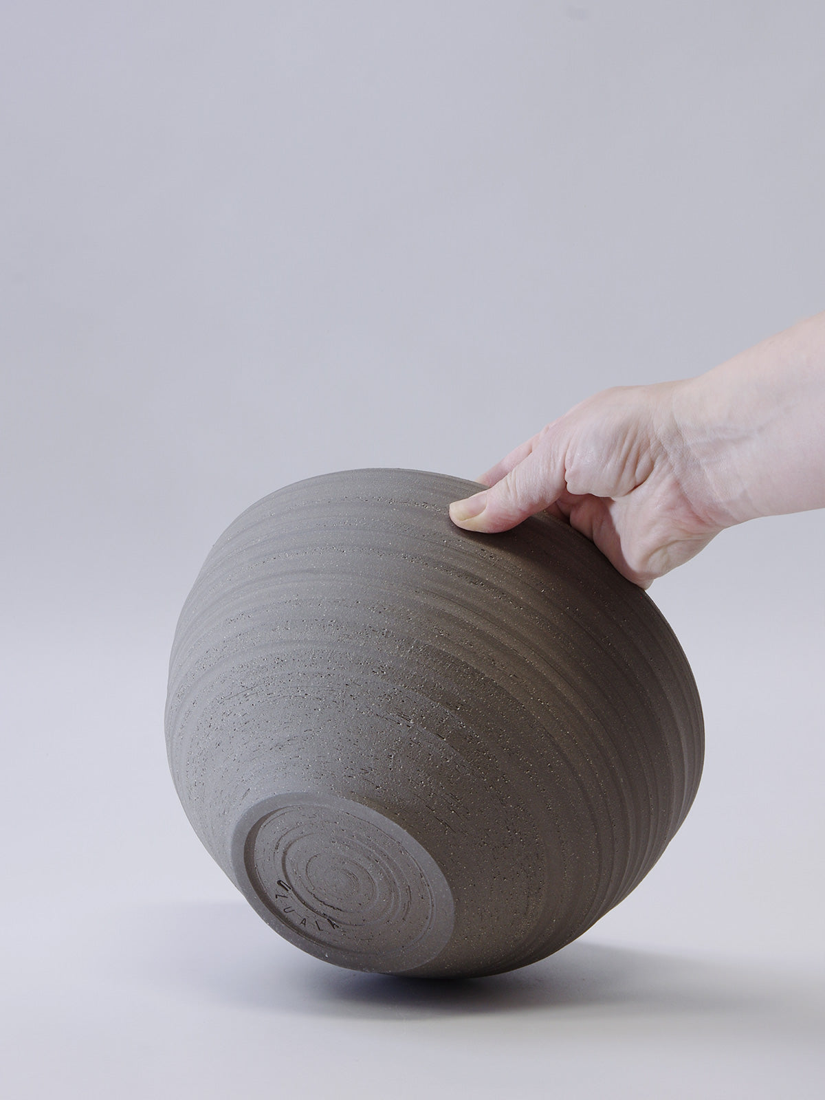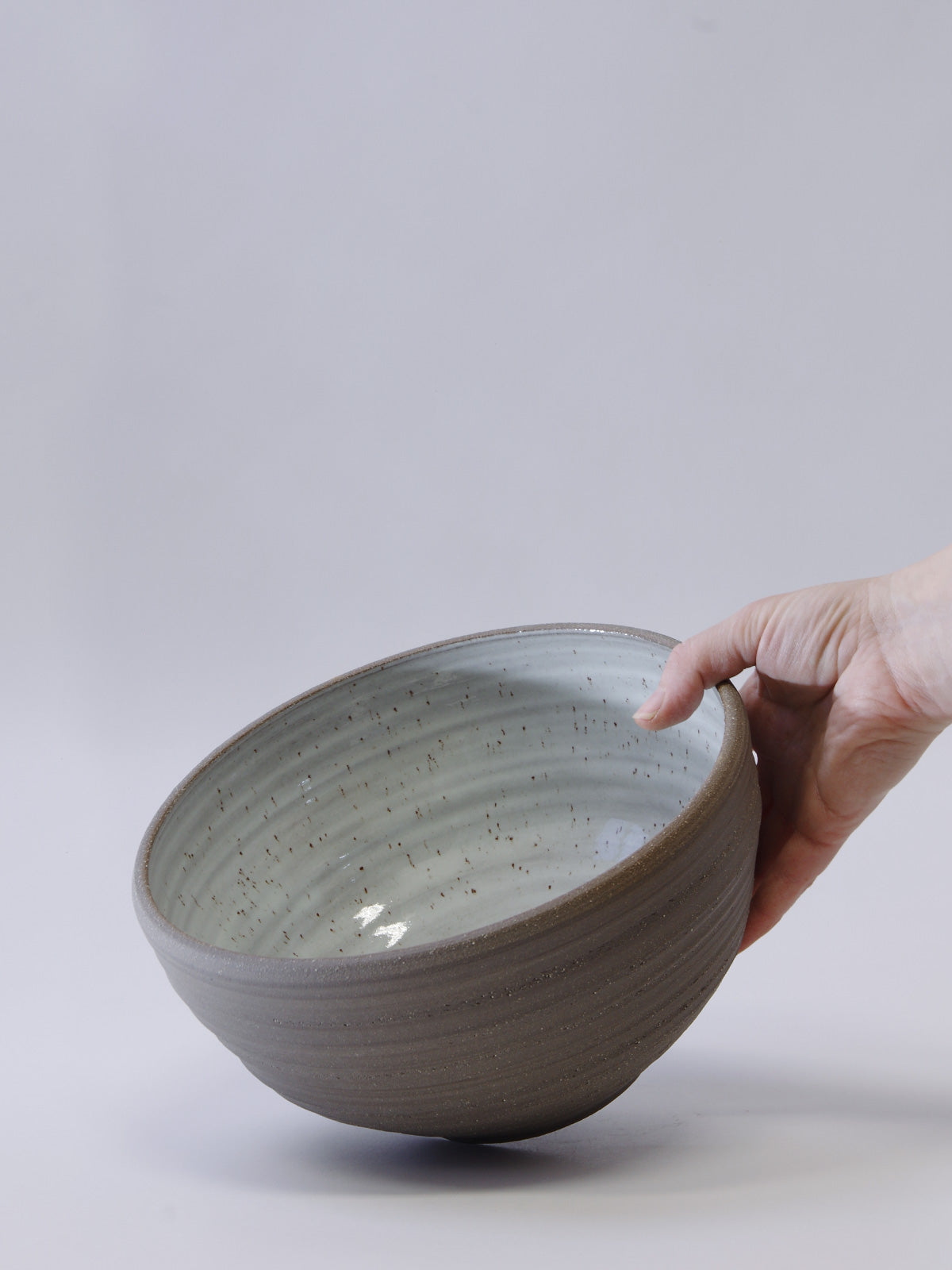 Grey stoneware with white shiny glaze with speckles. Works great as decorative piece but also serves you as a practical bowl for salads or mixing dough. Exterior is unglazed natural surface. Machine washable. Thrown on a potters wheel.