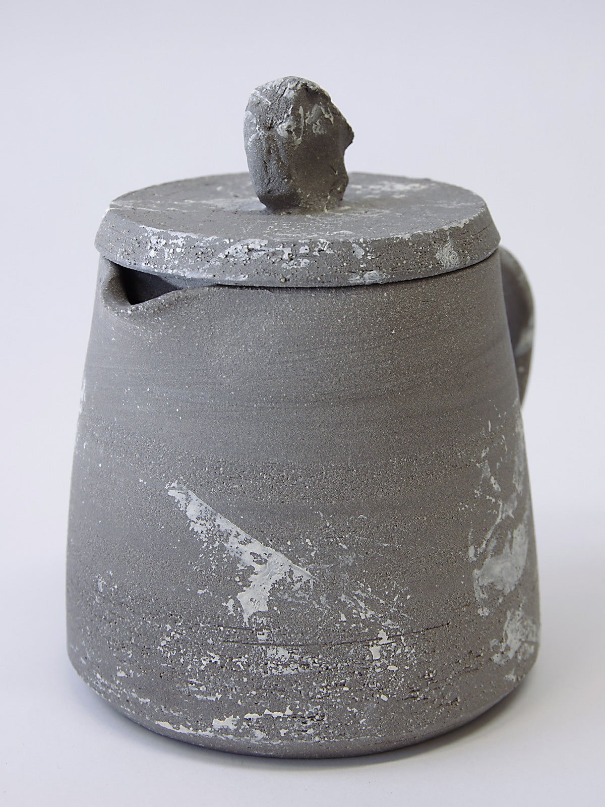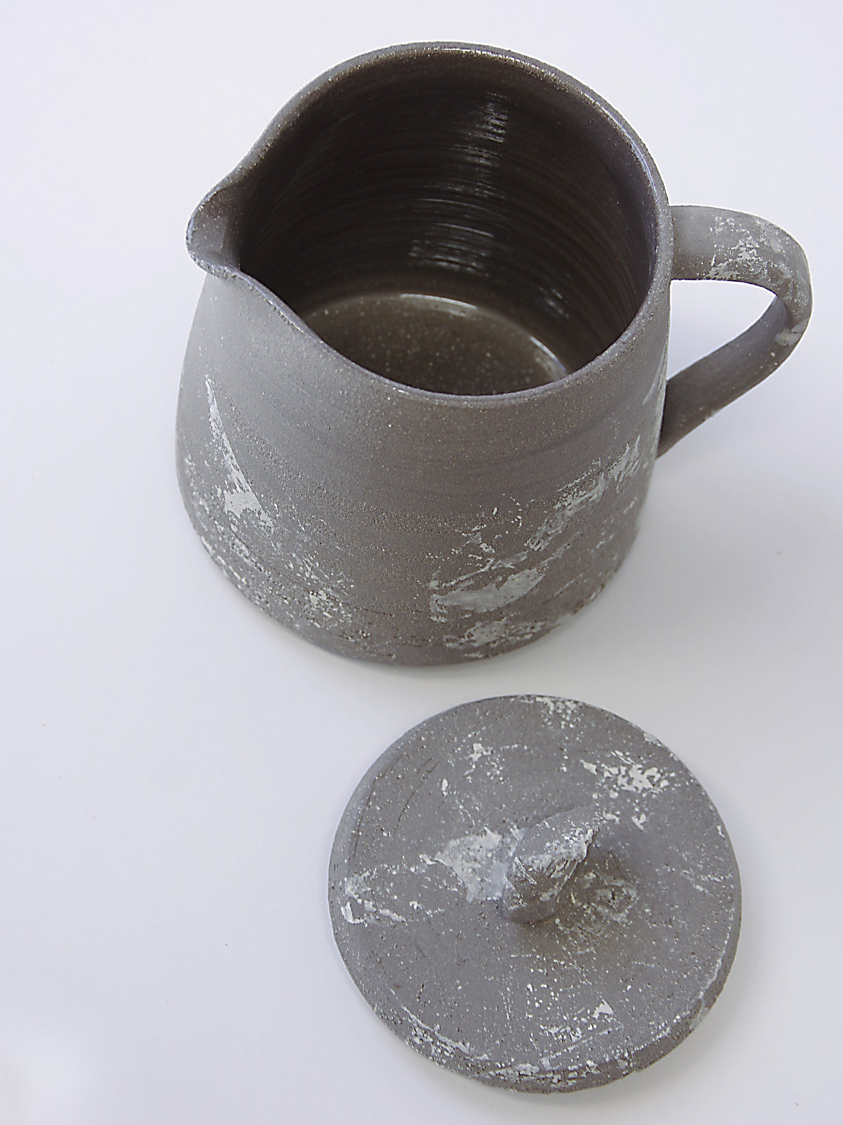 Set includes two tumblers and a teapot for your slow evening ritual. Teapot walls are thick enough to hold your tea hot longer. Grey stoneware with painted white allover and transparent shiny glaze inside for easy clean. Exterior is unglazed natural surface. Machine washable.